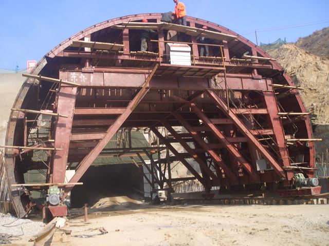 襯砌臺(tái)車(chē)是隧道施工過(guò)程中二次襯砌不可或缺的非標(biāo)產(chǎn)品,主要有簡(jiǎn)易襯砌臺(tái)車(chē)、全液壓自動(dòng)行走襯砌臺(tái)車(chē)和網(wǎng)架式襯砌臺(tái)車(chē)。全液壓襯砌臺(tái)車(chē)又可分為邊頂拱式、全圓針梁式、底模針梁式、全圓穿行式等。在水工隧道和橋梁施工中還普遍用到提升滑模、頂升滑模和翻模等。全圓式襯砌臺(tái)車(chē)常用于水工隧道施工中,不允許隧道有砼施工縱向接縫,在水工隧道跨度較大時(shí)一般使用全圓穿行式;邊頂拱式襯砌臺(tái)車(chē)應(yīng)用最為普遍,常用于公路、鐵路隧道及地下洞室的砼二次襯砌施工。本文著重介紹山嶺隧道施工中常用砼襯砌臺(tái)車(chē)的設(shè)計(jì)與使用。